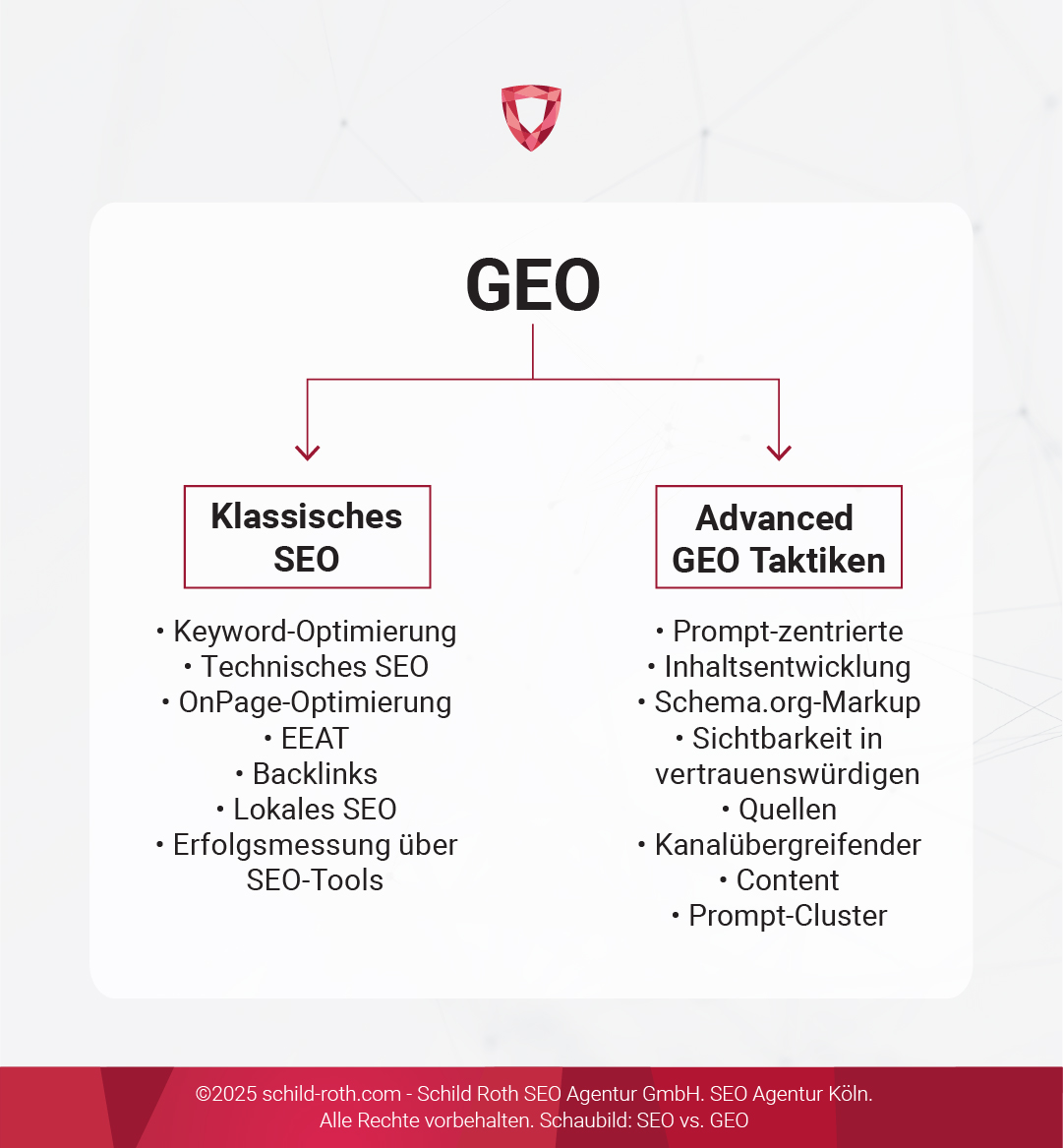 Während klassisches SEO die Grundarbeit von GEO leistet, werden die Ansätze um entscheidende Faktoren erweitert.